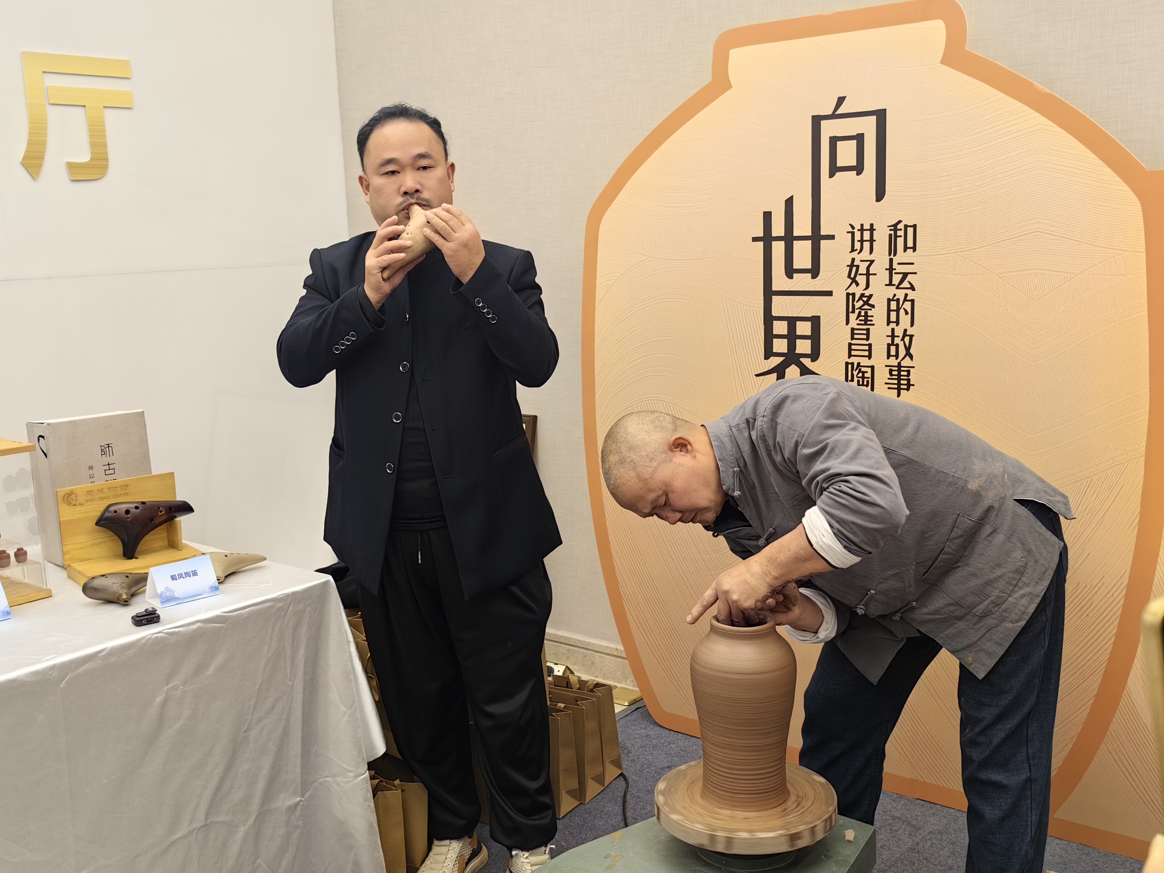 11月5日,“万千表象看四川·县域经济高质地发展”系列主题新闻发布会隆昌专场举行。会场外,非遗代表性传承东谈主曾义友现场演奏陶笛,非遗匠东谈主罗先贵专注地展示拉坯本事。支配的展桌上,展示着不久前在法国巴黎卢浮宫“海外文化遗产展览会”上,亮相的隆昌陶工艺品。